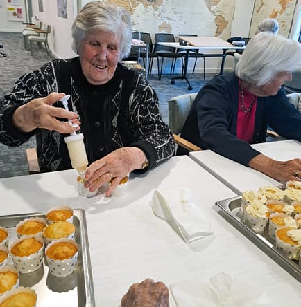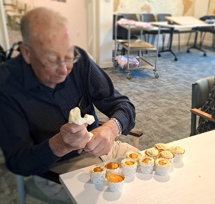 Copies of sepia toned newspapers from throughout the years covered a large cake board and our residents iced the cakes with rosettes and swirls and scattered sprinkles amid laughter and good-hearted instruction.