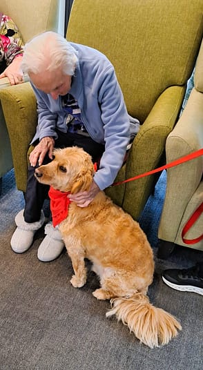 Many of the resident’s eyes light up when Rusty is near, she is patted and hugged and told what a ‘beautiful girl she is’. The staff also love the weekly visits, and they gently encourage some of the less responsive residents to pat Rusty’s furry coat.